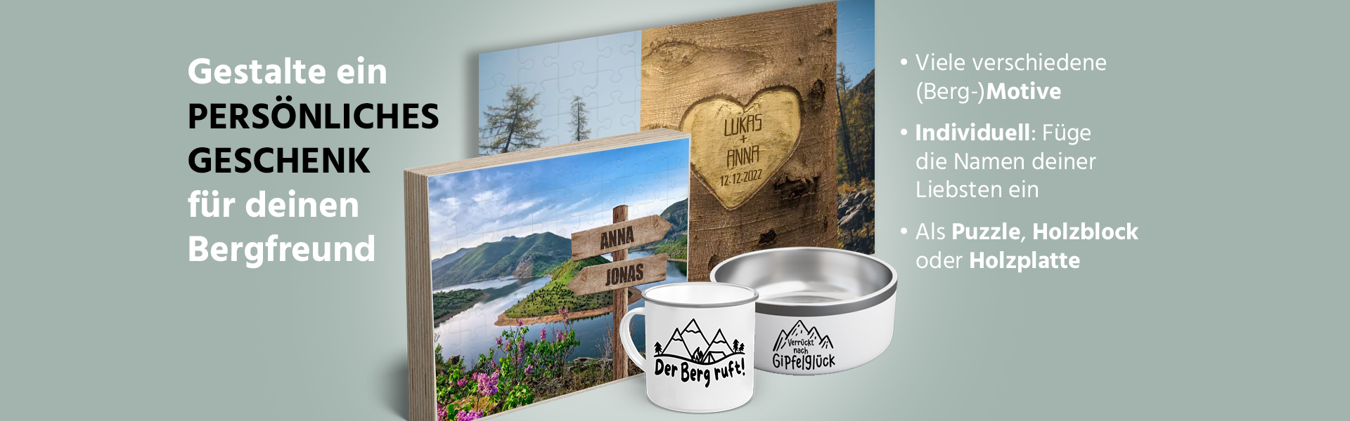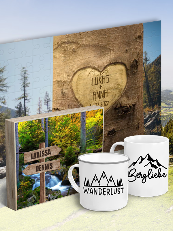 Dann bist du bei uns genau richtig! Mit unseren personalisierten Puzzle und weiteren Produkten erstellst du schnell ein individuelles und persönliches Geschenk. Bringe die Schönheit der Berge in dein Leben und schaffe Erinnerungen, die ewig halten.
